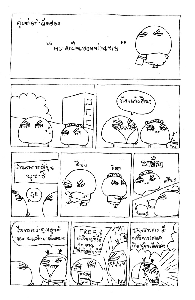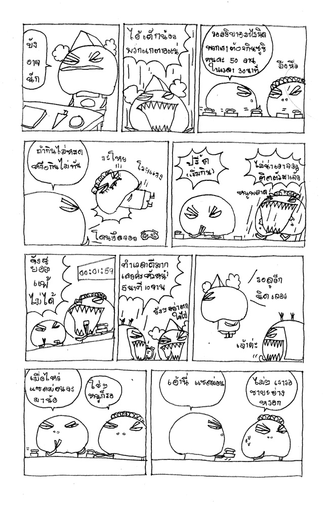 | Administrator | การ์ตูนตอนนี้วาดเอาไว้นานนมแล้ว เป็นการ์ตูนรีมิกซ์ หรือ ตอนที่เรียกว่าเมดเล่ห์แล้วกันครับ เอาการ์ตูนหลายๆ ตอนมายำใส่ตอนเดียว คัดสรรเอามุขแหล่มๆ มารวมกัน ซึ่งวาดไว้ตอนที่ชีวียังหวานชื่น เมื่อมันไม่ได้ถูกใช้ประโยชน์ในอย่างที่มันจะเป็นและไปรื้อคนเจอในลังกระดาษ ก่อนที่ปลวกจะมากินไป เลยจับเอามาสแกนเรียกขวัญและกำลังใจการการวาดการ์ตูนให้ตัวเองและน้องๆ [ที่อยากมีกำลังใจวาดการ์ตูน] ได้อ่านกัน พี่เอ็มว่า พอน้องๆ ได้ลองวาดการ์ตูนกันไปสักพักหนึ่ง ก็จะรู้ว่า สไตล์การวาดของตัวเองเป็นอย่างไร หากใครอ่านการ์ตูนพี่เอ็มหลายตอนคงจะจับทางได้บ้างว่าพี่เอ็มชอบใส่อะไรไปในการ์ตูนบ้าง ลองอ่านการ์ตูนเก่าๆ ดูนะครับ การ์ตูนตอนต่อไป >>> การ์ตูนนายเอ็มยังมิมีชื่อเรื่อง อ่านและแนะนำกันได้เลยจ๊ะ การ์ตูนก่อนหน้านี้ >>> การ์ตูนลูกพร้าวปะทะอิคคิวซัง ตอน เจ้าของบริษัทน้ำมัน