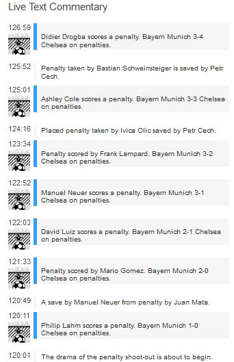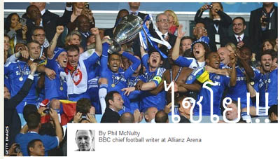 | Administrator | Chelsea win dramatic Champions League ไชโย!! เชลซีดราม่าจนได้แชมป์ยูฟ่า Chelsea stunned Bayern Munich in a dramatic penalty shoot-out at the Allianz Arena to win the Champions League for the first time. เชลซีทำเอาบาเยิร์นงงเป็นไก่ตาแตกเมื่อเล่นดราม่าจนถึงช่วงยิงจุดโทษเอาชนะได้คาถิ่นอลิอัน อารีนาในฟุตบอลยูฟ่าแชมปี้ยนลีก ทำให้เชลซีคว้าแชมป์นี้เป็นครั้งแรกในประวัติศาสตร์ (ผมเน้นแปลข่าวอาร์เซน่อลกับข่าวฟุตบอลที่ดังๆเท่านั้นครับ ข่าวอื่นไม่แปล) Thomas Mueller's late header put Bayern on the brink of victory on home territory but Didier Drogba levelled things up with a bullet header at the death before coolly converting the decisive spot-kick. โทมัส มุลเลอร์ถึงกับต้องส่ายหัวเมื่อเมื่อบาเยิร์นเกือบจะได้แชมป์อยู่แล้วในบ้านตัวเอง แต่ดร็อกบ้าก็มาโหม่งตีเสมอทำให้มันเกิดความแตกต่างในเกมส์ขึ้นอีกครั้งหนึ่งในช่วงก่อนหมดเวลา The tournament which gave Chelsea their greatest agony when they lost on penalties to Manchester United four years ago in Moscow has now delivered the greatest glory in their 107-year history. ในทัวร์นาเม้นนี้เมื่อตอนที่เชลซีใกล้เคียงกับการได้แชมป์นี้มากที่สุดก็คงเป็นตอนนี้ดวลจุดโทษกับแมนยูในนัดชิงแชมป์เปี้ยนลีกเมื่อ 4 ปีที่แล้ว ตอนนี้เชลซีก็ทำสำเร็จมันเป็นสิ่งที่ยิ่งใหญ่ที่สุดในรอบ 107 ปีของสโมสร ขอบคุณ BBC sport