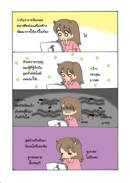 | การ์ตูน Ojichan Watashi&Baby ตอน ฟังเพลงคลาสสิก เพื่อนๆ หลายๆ คนที่กำลังจะเป็นแม่ หรือ เตรียมตัวเป็นแม่ น่าจะเคยอ่าน จะพบว่าหลายบทความที่อ่านหรือ คุณหมอเค้าแนะนำ ก็บอกให้แม่ฟังอะไรที่อารมณ์ดีนะ อย่างเช่นเพลงคลาสสิก แต่จริงๆ เสียงที่ลูกชอบฟังที่สุดก็คือเสียงแม่ ![]() | ||