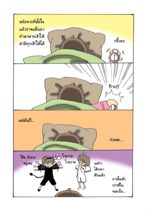 | การตูน Ojichan Watashi&Baby สู้กับจิตใจตัวเองกัน ตอน ลุก ไม่ลุก วันนี้ ปารมี ตั้งใจจะทำอาหารเช้าให้อีลุงทาน นาฬิกาก็ปลุกแล้ว แต่จิตใจปารมียังหาที่ลงไม่ได้ เลยมีตัวนางฟ้ากับซาตานปรากฏ ทั้งสองตัวยังเถียงกันอยู่ อิอิ เชื่อว่าเพื่อนๆ ก็คงเจอเหตุการณ์แบบนี้บ้างล่ะ เวลาอยากทำอะไรในตอนเช้าซักอย่าง อาทิ ตักบาตร ผลสุดท้ายถ้ามัวมานอนต่อคงชวด ไม่ได้ทำบุญ เหมือนพอจิตใจฝ่ายดีกับร้ายเถียงกัน มันดูเสียเวลาจริงๆ นั้นแหละค่ะ เพราะสุดท้ายพอไม่มีเวลาเหลือแล้วจิตใจด้านมารก็ชนะทุกที อิอิ ![]() ![]() ![]() แก้ไขครั้งสุดท้ายโดย poohba : 05-07-2012 เมื่อ 06:47 | ||