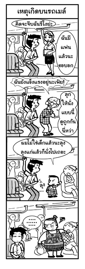 | หากเพื่อนๆ ชอบขึ้นรถเมล์ และยิ่งเป็นเวลาเร่งด่วน คนเยอะแยะมากมาย วันนี้เรามาลองดูสาเหตุที่หนุ่มๆ บางคนไม่เอื้อเฟื้อต่อเด็ก สตรีและคนชราครับ เคยเห็นคนปรารถนาดีลุกให้คนอื่นนั่งบ้างไหม แต่ถ้าลุกแล้วเขาไม่นั่งเหมือนในตูนนี้ก็ลำบากใจเหมือนกันนะ เจอแบบนี้ก็ทำให้ไม่อยากลุกเนาะ แต่ทำดีได้ความสุขก็ทำไป...ไม่เดือดร้อนเราพอ ![]() | ||