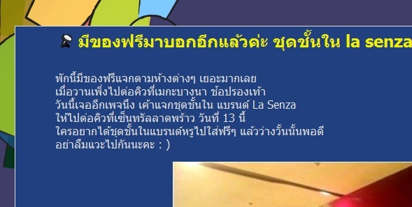 | พักนี้มีของฟรีแจกตามห้างต่างๆ เยอะมากเลย เมื่อวานเพิ่งไปต่อคิวที่เมกะบางนา ช้อปรองเท้า วันนี้เจออีกเพจนึง เค้าแจกชุดชั้นใน แบรนด์ La Senza ให้ไปต่อคิวที่เซ็นทรัลลาดพร้าว พรุ่งนี้ 2 รอบ (11 โมง กับ 5 โมงเย็น) รอบละ 100 คน คนนึงได้ 1,000 บาท ใครอยากได้ชุดชั้นในแบรนด์หรูไปใส่ฟรีๆ แล้วว่างพรุ่งนี้พอดี อย่าลืมแวะไปกันนะคะ : ) ![]() | ||