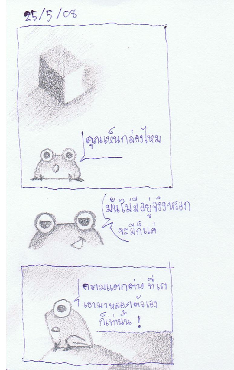 งั้นฝากปรัชญาไทยไว้บ้าง ไก่งามเพราะขน คนงามเพราะแต่ง แปลให้ตรงตัวก็คือ ถ้าใครอยากหล่อแบบไม่แต่งตัวต้องไปเป็นไก่เพราะขนมันสวยอยู่แล้ว เออแล้วเรื่อง กล่องกับกบ นี่มันคืออะไรครับผมงง นอกเรื่องไปเยอะเลย ไม่ใช่เป็นแบบเรื่องนี้นะ