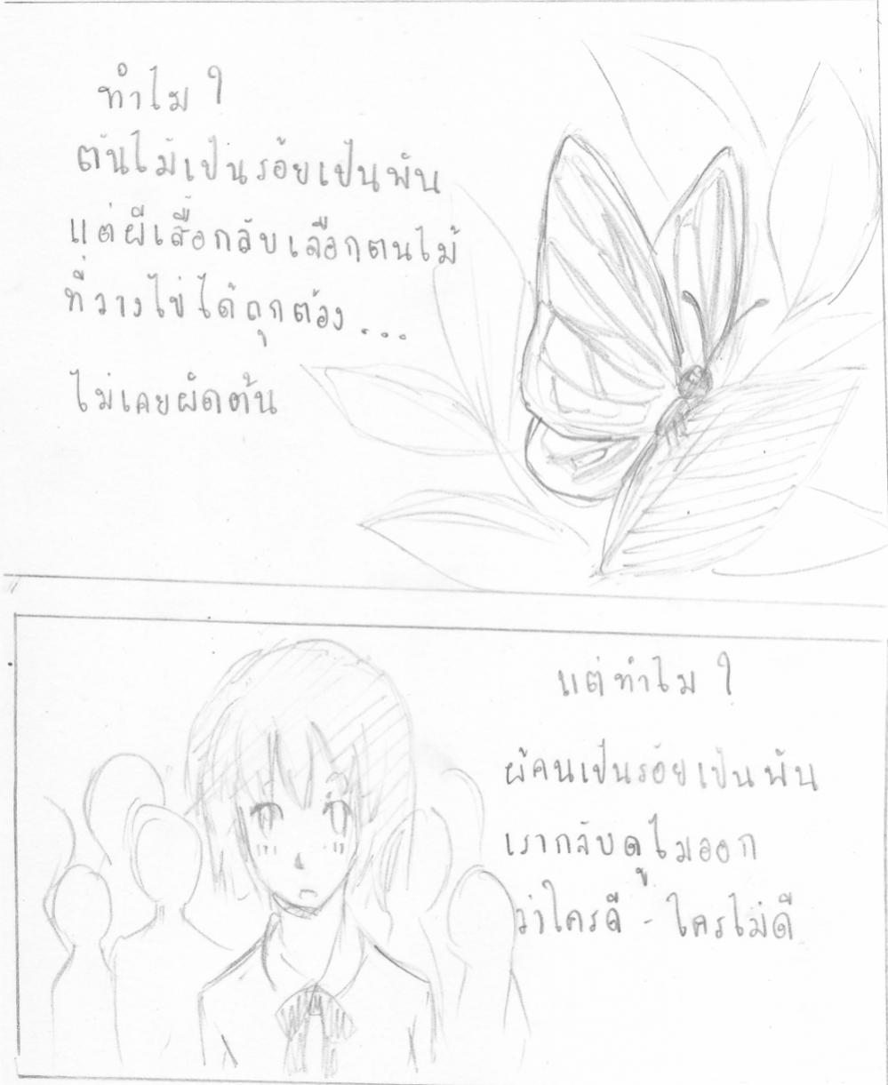 เรื่องมันมีอยู่ว่า ระหว่างไปเดินเล่น ก็เจอผีเสื้อกำลังหาใบไม้เพื่อวางไข่ เลยลองวาดการ์ตูน 3 ช่องดู