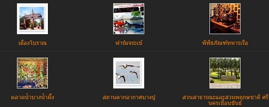 | เมืองสมุทรปราการนั้นนับว่ามีแหล่งท่องเที่ยวที่น่าสนใจและยังมีแหล่งของฝาก อีกทั้งยังเป็นเมืองแห่งอุตสาหกรรมอีกด้วย ปลาสลิดบางบ่อ คือของดีที่ใครมาใครไปจะต้องซื้อติดไม้ติดมือเสมอ ๆ เพราะมีรสชาติอร่อยกว่าที่อื่น เนื้อแน่น ชวนให้น้ำลายสอ นอกจากนั้นยังมีพระสมุทรเจดีย์ เจดีย์กลางน้ำที่น่าไปชมไปเดินเที่ยวเป็นอย่างมาก ป้อมแผงไฟฟ้า ก็เป็นอีกที่ ๆ น่าไประหว่างทางยังมีอาหารทะเลให้เลือกรับประทานกันอย่างจุใจในบรรยากาศเป็นกันเองอีกด้วย นอกจากนี้ยังมีอีกที่หนึ่งที่ควรแวะระหว่างทางนั่นคือ พระประแดง ซึ่งเป็นถิ่นชาวมอญ และยังมีตลาดน้ำบางน้ำผึ้ง ของฝากอร่อย หลากหลาย มีนักท่องเที่ยวต่างชาติมาพักแบบโฮมเสตย์เพื่อดื่มด่ำกับธรรมชาติอาจเพราะธรรมชาติที่นี่ยังคงบริสุทธิ์อยู่มาก ต้องไม่ลืมซื้อสินค้ากลับไปฝากคนในครอบครัว กาละแม ขนมของชาวมอญ เป็นต้น หรือจะไปฟาร์มจระเข้ได้อารมณ์ไปอีกแบบ สถานที่ท่องเที่ยวในจังหวัดสมุทรปราการยังมีอีกมากให้เชิญเลือกในวันหยุดของคุณ เมืองโบราณ ฟาร์มจระเข้ ฟาร์มจระเข้ พิพิธภัณฑ์ทหารเรือ พิพิธภัณฑ์ทหารเรือ ตลาดน้ำบางน้ำผึ้ง ตลาดน้ำบางน้ำผึ้ง สถานตากอากาศบางปู สถานตากอากาศบางปู สวนสาธารณะและสวนพฤกษชาติ ศรีนครเขื่อนขันธ์ สวนสาธารณะและสวนพฤกษชาติ ศรีนครเขื่อนขันธ์ วัดกลางวรวิหาร วัดกลางวรวิหาร วัดบางพลีใหญ่กลาง วัดบางพลีใหญ่กลาง ป้อมยุทธนาวี พระเจดีย์กลางน้ำ ฟาร์มจระเข้ใหญ่ งามวิไลเมืองโบราณ สงกรานต์พระประแดง ปลาสลิดแห้งรสดี ประเพณีรับบัว ครบถ้วนทั่วอุตสาหกรรม จังหวัดสมุทรปราการตั้งอยู่ในภาคกลางของประเทศไทย ที่บริเวณปลายสุดของแม่น้ำเจ้าพระยา ติดชายฝั่งทางด้านเหนือของอ่าวไทย เป็นจังหวัดขนาดเล็กบริเวณชานเมืองกรุงเทพมหานคร มีชื่อเรียกอื่นๆ อีกว่า ?เมืองปากน้ำ? และ ?เมืองพระประแดง?สมุทรปราการเป็นที่ตั้งของนิคมอุตสาหกรรมขนาดใหญ่ที่สำคัญของประเทศ มีชาวต่างชาติเข้ามาลงทุนทำธุรกิจเป็นจำนวนมาก จึงเป็นจังหวัดที่นำรายได้เข้าสู่ประเทศเป็นจำนวนมหาศาลในปัจจุบัน จังหวัดสมุทรปราการมีเนื้อที่ประมาณ 1,004 ตารางกิโลเมตร หรือประมาณ 627,557 ไร่ จัดเป็นจังหวัดที่มีขนาดใหญ่เป็นอันดับที่ 70 ของประเทศไทย มีแม่น้ำเจ้าพระยาเป็นแม่น้ำสายสำคัญ และมีคลองสาขาแยกจากแม่น้ำเจ้าพระยาจำนวนมาก สภาพภูมิประเทศโดยทั่วไปเป็นที่ราบลุ่ม แบ่งเป็น 3 บริเวณ คือ บริเวณริมสองฝั่งแม่น้ำเจ้าพระยา เหมาะแก่การทำนาและทำสวน บริเวณตอนใต้ใกล้ชายฝั่งทะเล น้ำทะเลท่วมถึง พื้นดินและแหล่งน้ำจืดเค็มจ