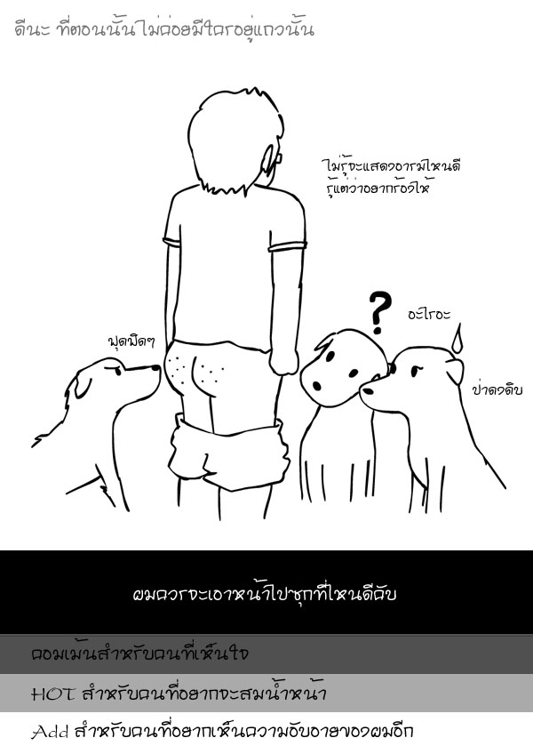 | วันนี้ตูน ออกเรท แต่สนุกดี นานๆ ครั้งจะเจอเรื่องฮา ของคนกับ หมา ซะหน่อย เลยเอามาฝากเพื่อนๆ หากเพื่อนๆ เลี้ยงสุนัข คงจะรู้นิสัยของพวกมัน ที่บางตัวหรือแทบทุุกตัว ชอบตะกุยขึ้นตัวของเรา ไม่ว่าเวลาเราจะให้อาหาร หรือกลับมาจากการทำงาน หรือเรียน แต่อะไรจะโชคร้ายขนาดในตูนนี้ เค้าเคยเจอแบบเกือบๆ ดีนะที่จับไว้ทัน ไม่งั้นกางเกงคงหลุดแน่ๆ หมาดึงกางเกง ดีนะที่มันแค่ดึงอย่างเดียว อิอิ ใครเห็นก้นคงเป็นตากุ้งยิง ฟิ้วๆ เลยล่ะ ![]() ![]() ![]() ![]() ![]() | ||