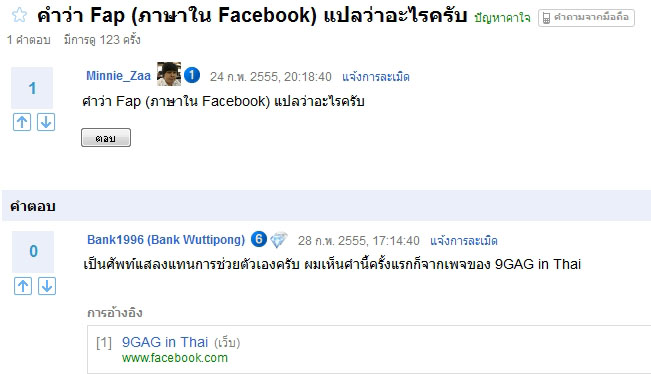 | Senior Member | Nuray : มีน้องคนหนึ่งเค้าถามมาค่ะว่า fap แปลว่าอะไรเค้าบอกว่าเห็นมาในอินเตอร์เน็ต พอเราไปค้นหาก็เจอคนเค้าคอมเม้นว่า fap แปลว่า XXXXX อย่างที่รูปด้านล่างนั้นแหละ อยากถามผู้รู้ค่ะว่าfap แปลว่าแบบนั้นจริงจริงหรือค่ะ คุณเอ็มคุณโอมน้องเช็ดขี้คุณบุญกึ่ม ช่วยมาแสดงความคิดเห็นกันด้วยค่ะอยากรู้จริงๆ RoiGOo : เป็นคำที่ผมเองก็ไม่รู้ความหมายเหมือนกันไอ fap แปลว่าอะไรเนี้ย แต่พอนู๋เรย์มาถามก็มีคนมาตอบเยอะจนผมรู้แล้วว่า fap แปลว่าอะไร55555555 ![]() fap แปลว่าแบบนี้จริงจริงหรอค่ะ ![]() คำที่หลายคนสงสัยแปลว่าอะไรกัน dealfish แปลว่าอะไรหรือว่าเป็นเพียงเว็บไซต์เว็บหนึ่ง จากคำว่า "ฟิน" สู่คำว่า "เซราะกราว" มันแปลว่าอะไรกัน featuring(ฟีทเจอริ่ง) แปลว่าอะไร ภาษาทางการกับภาษาวัยรุ่นเข้าใจต่างกัน ซึนเดเระหรือคำว่าซึน แปลว่าอะไรค่ะ fap แปลว่าอย่างนี้จริงจริงหรือค่ะ อยากถามผู้รู้เรื่องนี้ค่ะ หลังจากนู๋เรย์ถามว่า ฟิน กับ Fap แปลว่าอะไร ผมก็สงสัยในคำว่า wtf แปลว่าอะไรมาดู by the way และ on the way แปลว่าอะไรใช้งานต่างกันอย่างไร หรอย ในภาษาใต้แปลว่าอะไร คลิกทางนี้เลยครับ